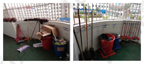 垃圾桶及清掃工具擺放凌亂;